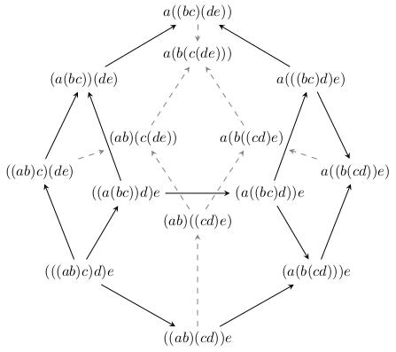 Let's try and prove that every bracketing of \(MNPQ\) is equivalent by only using the "associativity move" \((AB)C=A(BC)\). First, let's list all the possible bracketings. To generate this list, I'm just saying "which pair do I multiply together first? Maybe \(MN\). Now I can either multiply the result with \(P\) (and then I have to multiply the result with \(Q\)) or I can do \(PQ\) and then do \((MN)(PQ)\)..." and so on. Here is the result: \[((MN)P)Q,\quad (MN)(PQ),\quad M((NP)Q),\quad (M(NP))Q,\quad M(N(PQ)).\] Now let's connect these bracketings with lines whenever there's an associativity move linking them: