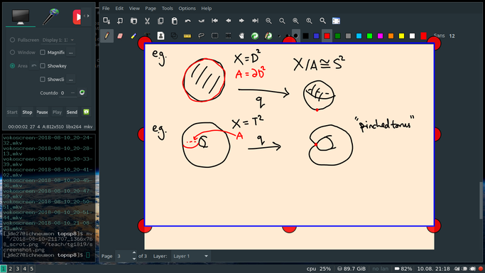 Vokoscreen is the small program in the top left and I have a terminal window open below it so that I can delete unwanted clips/bloopers immediately. The xournal file is open on the right. If you want your windows to tile like this, I can highly recommend a tiling windows manager like i3 or xmonad (I use i3). The weird blue area with the red circle segments shows you which area of the screen is being captured by vokoscreen.