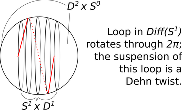 Suspending this loop by the above prescription gives us the Dehn twist on \(S^2\). Unfortunately the Dehn twist on \(S^2\) is trivial in the mapping class group, but this should give you a sense of how the diffeomorphisms in \(G_1(n)\) arise.