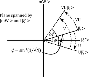 Now \(|\xi\rangle\) is a linear combination of \(|\xi'\rangle\) and \(|mW\rangle\) by construction, say \[|\xi\rangle=\cos\phi|\xi'\rangle+\sin\phi|mW\rangle\] Moreover, we know that the coefficient of \(|mW\rangle\) in \(|\xi\rangle\) is \(1/\sqrt{N}\), so \[\sin(\phi)=1/\sqrt{N}.\] The two reflections \(U\) and \(V\) preserve the 2-dimensional subspace spanned by \(|\xi'\rangle\) and the vector \(|mW\rangle\). Indeed, reflecting using \(U\) gives \[U|\xi\rangle=\cos\phi|\xi'\rangle-\sin\phi|mW\rangle\] and the using \(V\) (exercise, very clear when you draw the picture!) gives