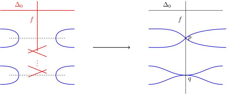 - Blow up \(\mathbf{F}_N\) at \(p\) and then repeatedly at \(q\) to separate the branches of \(D\). The fibre \(f\) becomes a \(-2\)-curve (it had square zero and is blown up twice). The exceptional curve of the blow-up at \(q\) is a string of \((N-5)\) \((-2)\)-curves followed by a \(-1\)-curve.